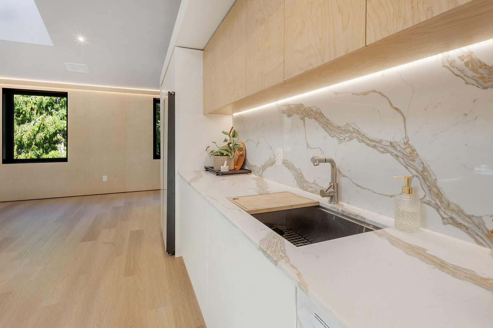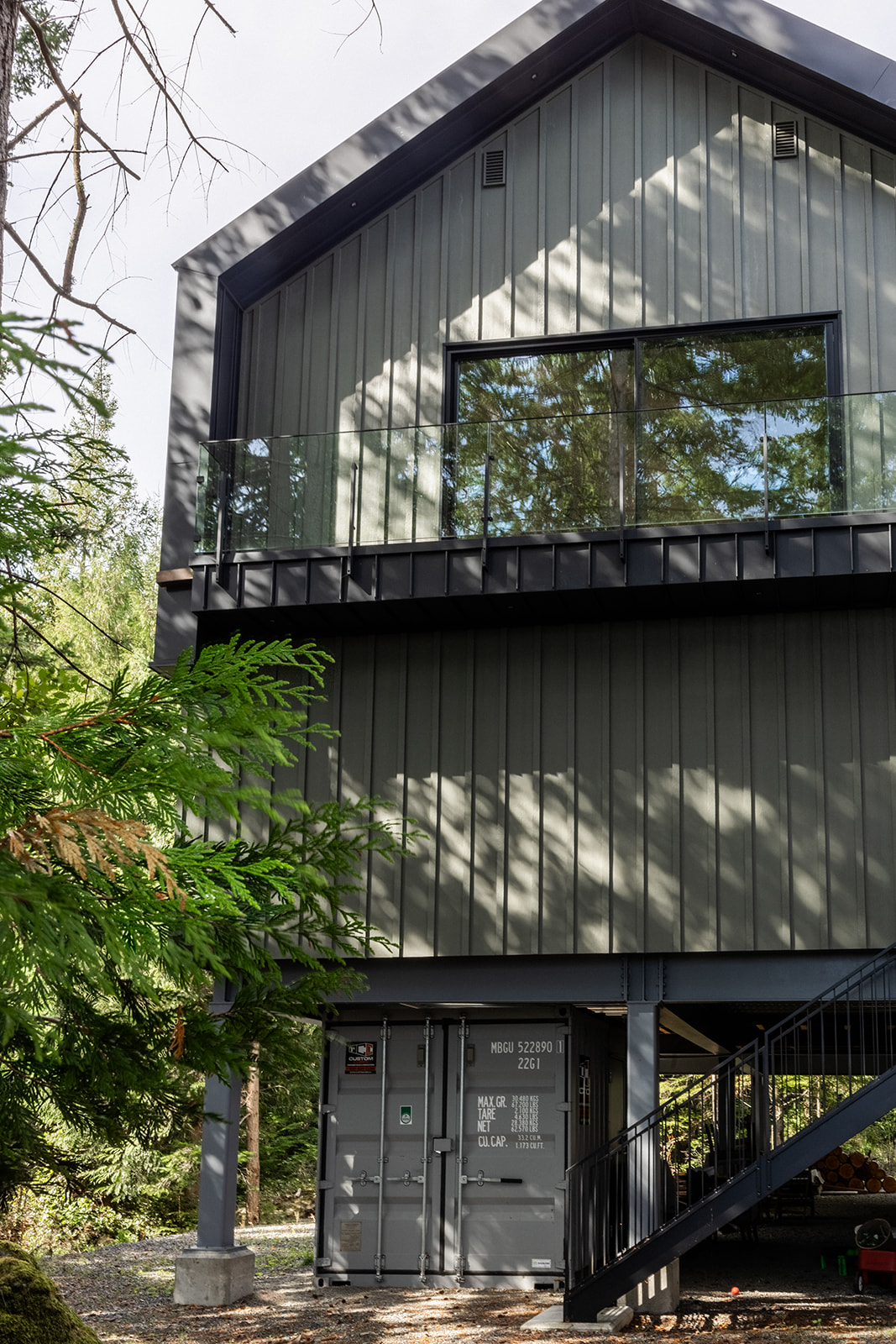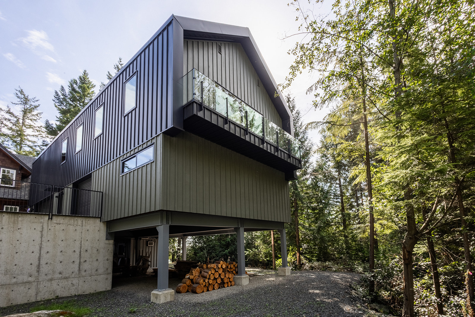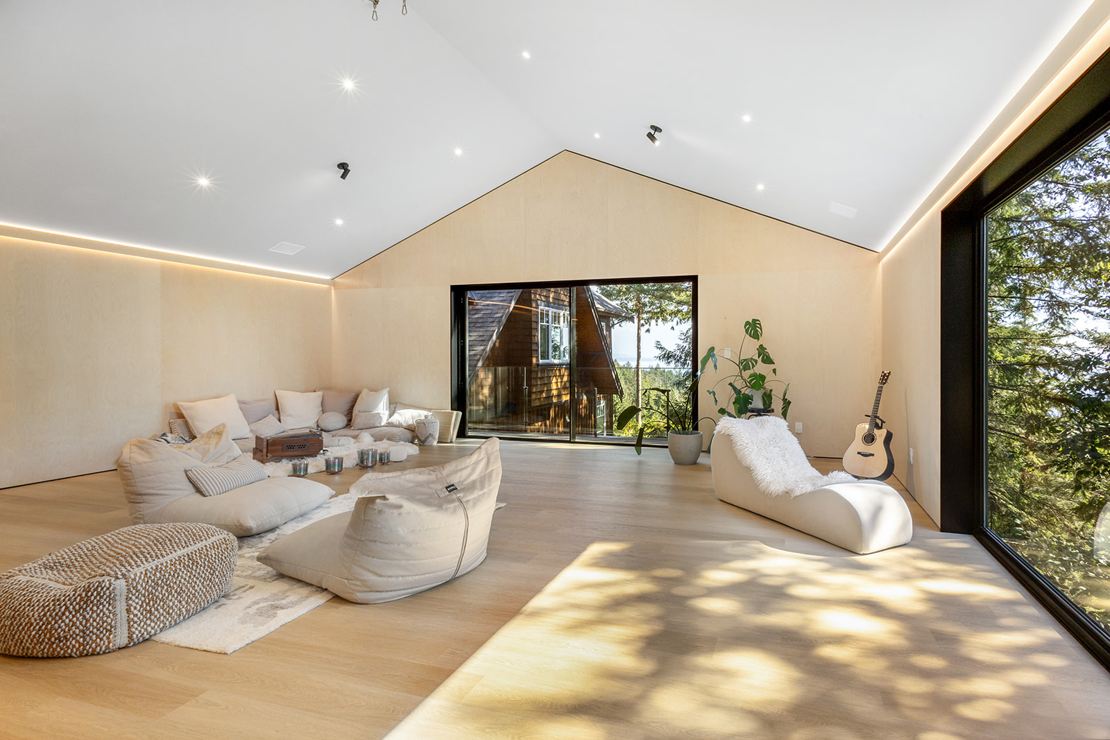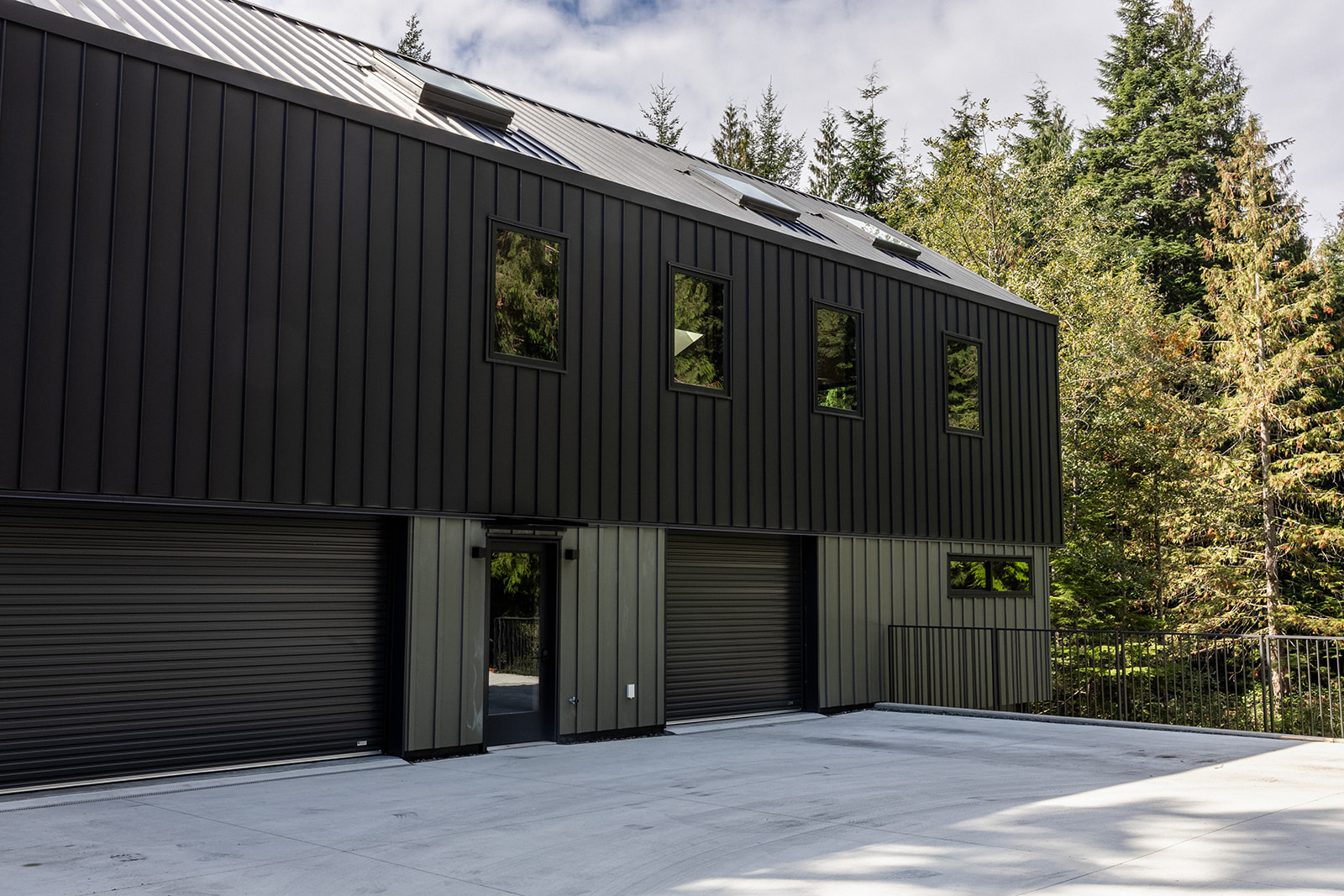 At first glance this looks like a monster garage. An expansive structural concrete slab supported by massive steel members makes the garage floor ready for anything but walk up the stairs to the studio area and the vibe completely changes. Light and airy with birch clad walls and skylights to allow the perfect amount of sunlight in and at night or the darker days perfectly placed LED lighting that provide a warm lighting projected up the ceiling and down the walls. A little bit of something for everyone.